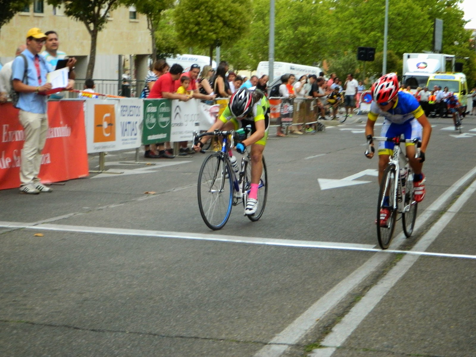 Comentar solamente un par de cosillas que no emborronan para nada la buena organización del evento. En la primera salida muchos de los corredores (principiantes de 1º año) casi no se enteraron de la misma, al estar en la línea de salida esperando a que acabara su labor el personal sanitario y porque los jueces no avisaron ni a la policía ni al coche que abría la prueba lo que ocasionó que algunos participantes de la carrera se encontraran, sin darse cuenta, prácticamente encima de la moto y el coche. Por otro lado, al igual que comentamos en el Campeonato de Castilla y León celebrado en Segovia, la salida era algo estrecha para el número de participantes teniendo que formar hasta cuatro lineas de corredores en alguna categoría. Entendemos que la "foto finish" solo abarca seis metros (aproximadamente dos carriles) y que esto limita la linea de meta pero no creemos que la de salida tenga que estar limitada cuando sólo 20 metros mas adelante se dispone de cuatro carriles para poder realizar una salida en linea que mejora las condiciones de muchos de los corredores, sobre todo en las primera carreras que son cortas y no es lo mismo salir en cabeza que tres filas por detrás.